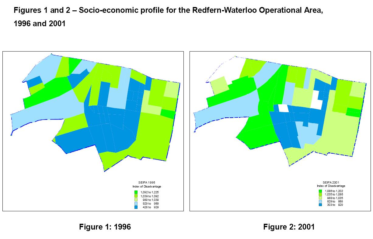 Index of Disadvantage - Socio-economic profile for the Redfern-Waterloo Operational Area, 1996 and 2001