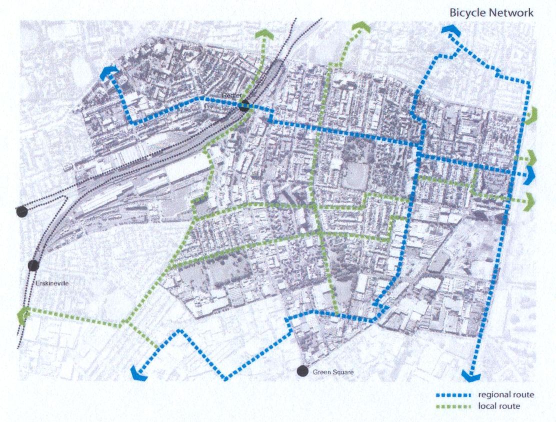 The RED Consultants proposed the following bicycle network for Redfern Waterloo. Source Slide 7 RED Strategy Consultation Overheads 25 June 200. File size is 240 Kb.