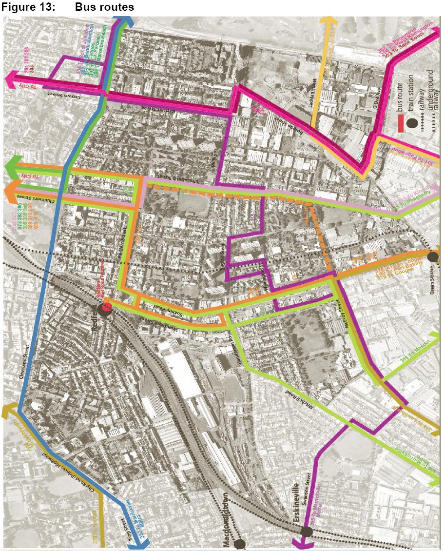 This maps show how the RED Area is served by bus routes. Bus routes tend to serve through trafic rather than the transport needs of those that live in the area. The RED consultation identified the need for both a local figure 8 bus route to enable local people to easily access Railway Stations as well as a wider service to allow the community to access hospital, shopping and open space. This map is Figure 13 "Bus toutes" from the NSW Government Submission for the Inquiry into Redfern and Waterloo 30 April 2004. File size is 287 Kb.