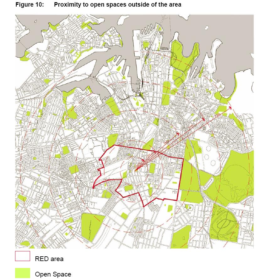 This map shows how the REDW area sits in proximity to surrounding open space. The RED Strategy consultation identified that while there was open space near the RED area there were problems for the local community accessing these areas. This map is Figure 10 "Proximity to open spaces outside ther area" from the NSW Government Submission for the Inquiry into Redfern and Waterloo 30 April 2004. File size is 174 Kb.
