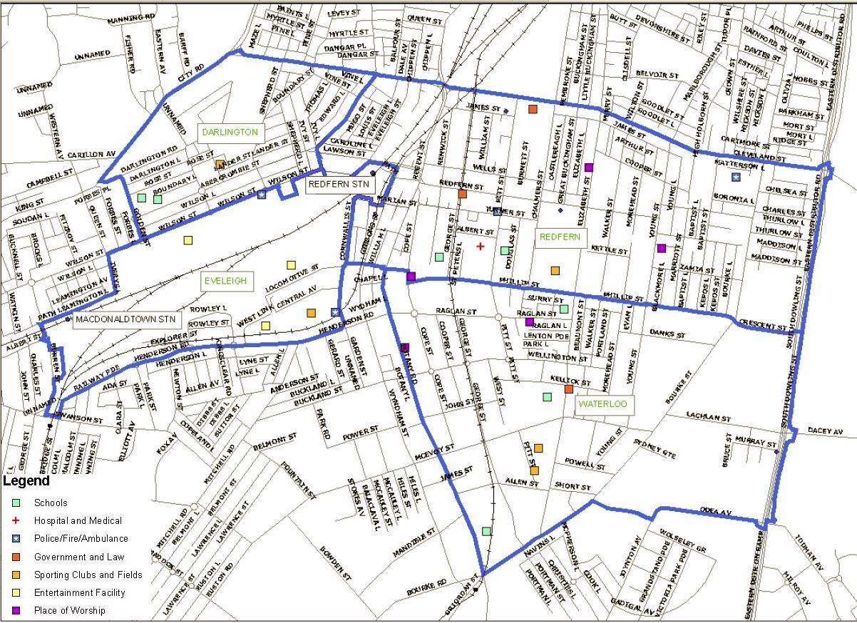 This map shows the major streets and selected community facilities in the RWA Area. This map is Figure 2 "Facilities in Redfern and Waterloo" from the NSW Government Submission for the Inquiry into Redfern and Waterloo 30 April 2004. File size is 265 Kb.