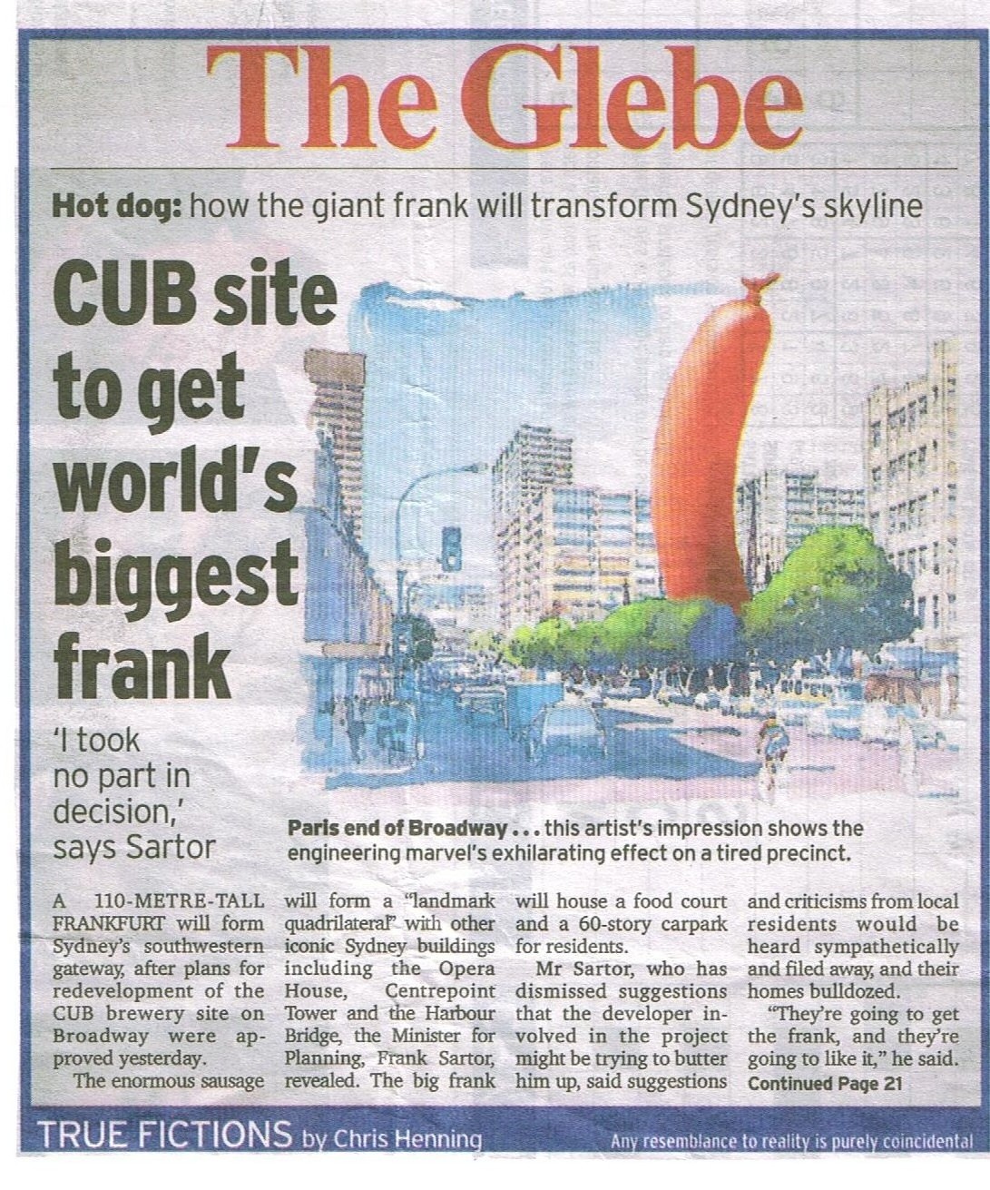 True Fictions on the Stay in Touch Column of the SMH on June 18th 2007 ran the attached made up story "Hot dog: how the giant frank will transform Sydney's skyline - CUB site to get world's biggest frank". File is 307 Kb Jpg.