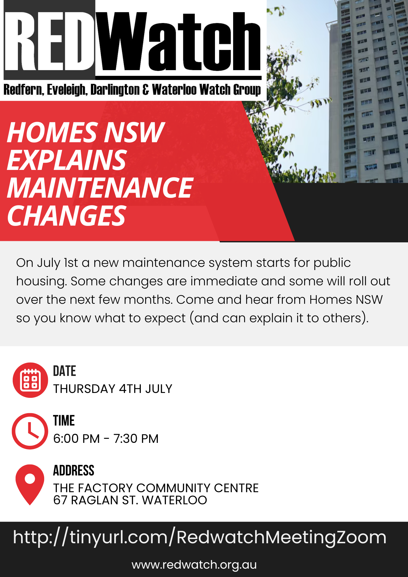 Homes NSW Explains Maintenance changes – REDWatch 4 July 2024 6pm flyer